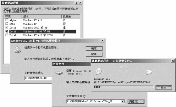 解决办法:有两种方法供大家选择。一是使用Windows XP的安装“其他驱动”方法来解决。以安装联想6110打印机为例,假设现在有20台Windows 98工作站,那么首先在任意一台工作站中安装6110 for 98驱动,然后将工作站“c:\windows\inf\”目录中的“lgbcpr.inf”文件复制到打印服务器中。接着进入打印服务器的共享打印机属性窗口,在“共享”选项卡设置界面中点击“其他驱动程序”按钮,在弹出的对话框中勾选“Intel Windows 95、98和ME”项,接着指定“lgbcpr.inf”文件的位置。在提示指定“lexgo.exe”文件时,指定驱动盘中的“Drivers\Win_9X\lexgo.ex_”文件即可,系统将自动复制所需的驱动文件(见图)。复制完毕后,在其他工作站中进行共享打印机的安装时就不再需要用户提供驱动了。不过这种方法比较繁琐,而且初学者很难判断在这个过程中所需的文件是哪些。